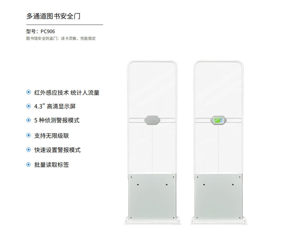 PC906 图书防盗门采用了三维感应技术,能在感应区内三维空间上任意方向快速检测电子标签;设备支持符合